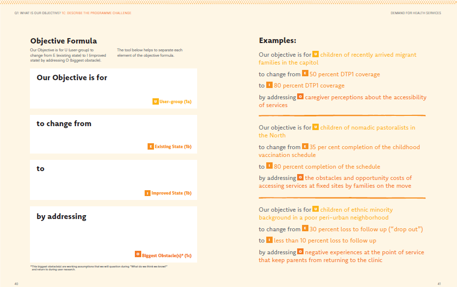 The UNICEF Human-Centred Field Guide provides an excellent introduction to defining ambitions and setting a clear, concise project goal. The Objective Formula: