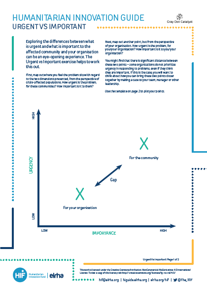 Download the template. First, map out where you feel the problem sits with regard to the two dimensions presented, from the perspective of crisis-affected populations. How urgent is the problem, for these communities? How important is it to them?