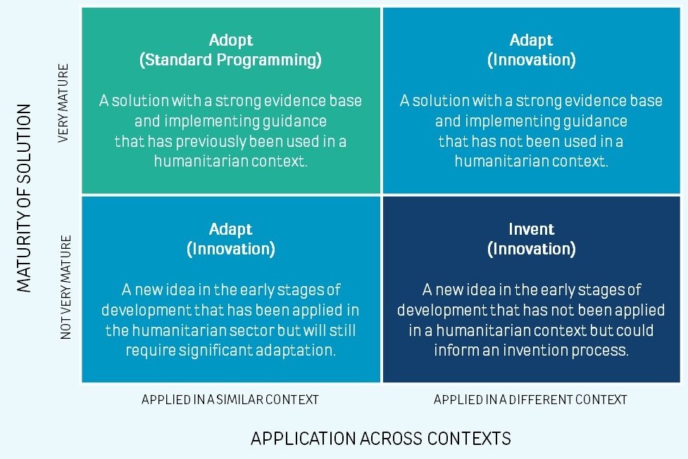 Another way to look at this is through a two-by-two table representing the maturity of the solution, and where that solution comes from (see below). Taking on a mature solution from the humanitarian sector is likely to be a fairly straightforward process but taking on a less mature solution is going to require a significant amount of learning and adaptation. Likewise, taking on a mature idea from outside the sector is still likely to require a fair amount of adaptation to repurpose it for humanitarian ends, and taking an immature idea from outside the sector is likely to require a very significant investment of resources and high risk.