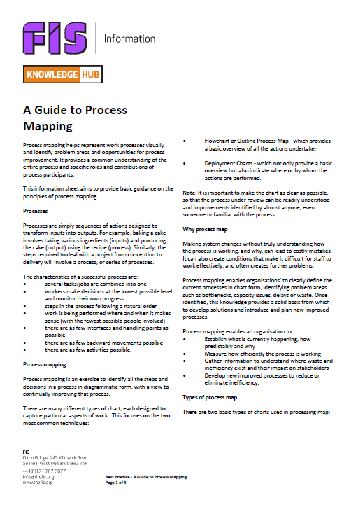 Download the FIS Best Practice Guide for Process Mapping below, familiarise yourself with the contents and plan a group exercise to map out the high-level process you anticipate. On a separate piece of flipchart paper, log any dependency or interaction with an established process in your organisation/s, and note any missing processes that will need to be developed in support of the high-level process you are creating.