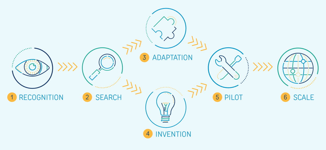 - Scale – Scaling the impact of an innovation to better match the size of the social problem it seeks to address. This stage involves building in the complexity required for a sustainable innovation and distilling this complexity to make it replicable.